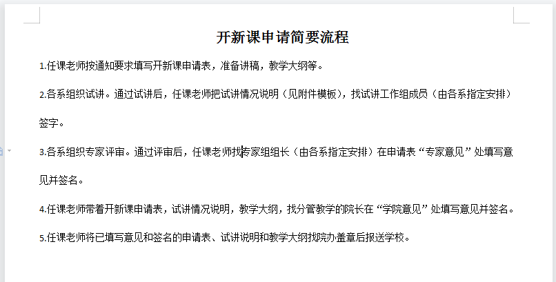 1.开新课教师向课程归属学院提交《申请表》、教学大纲和课程讲稿等,各系严格按照开新课教师应具备的条件进行初步审核和组织试讲,并提供书面试讲说明。
