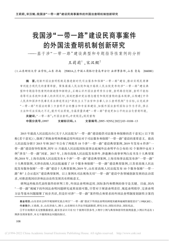 王莉莉副教授与其合作者在《山东财经大学学报》2022年第34卷第3期发表论文《我国涉“一带一路”建设民商事案件的外国法查明机制创新研究———基于涉“一带一路”建设典型和专题指导性案例的分析》。《山东财经大学学报》是全国高校优秀社科期刊、华东地区优秀期刊、山东省优秀期刊、RCCSE中国核心学术期刊,由山东财经大学主管主办。