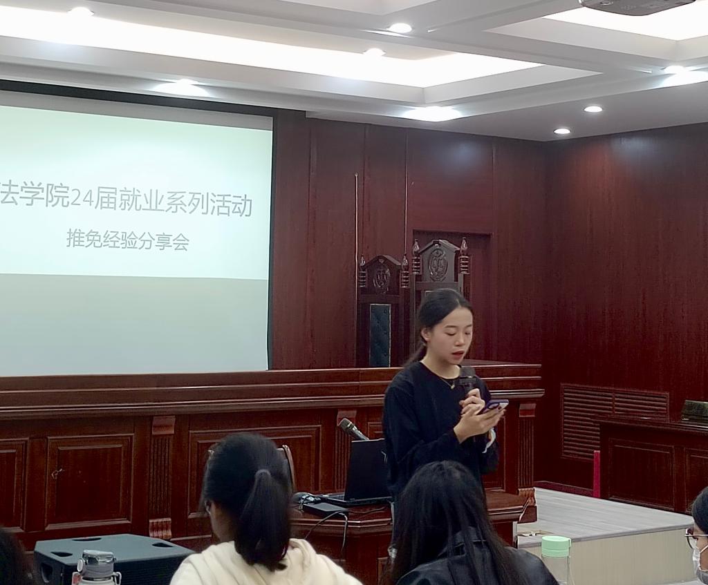 在模拟法庭举行了本年度推免经验交流会。学院邀请24届已经顺利推免成功的王文清、刘润苗、曾杨怡、王菁彧、石璐璐、刘家欣、宋欣茹、朱孟影八位同学围绕研支团、推免政策、相关院校信息以及她们各自总结的经验为低年级的同学进行了分享。
