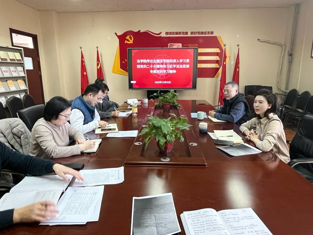 院长赵信会结合学院工作指出,我们要将会议精神传达给学院的每一位教职工,认真学习贯彻习近平法治思想,确保习近平法治思想进课堂、进教材、进头脑,学院必须将习近平法治思想作为我们法学人才培养铸魂固本的根本举措;坚持以习近平法治思想为指导加强中国特色社会法学理论研究,把习近平法治思想的研究、阐释作为首要任务,加强对习近平法治思想的原创性概念、判断、范畴、理论的研究,加强对习近平法治思想重大意义、核心要义、丰富内涵和实践要求的研究,立足构建中国特色社会主义自主法学知识体系,加强有中国特色社会主义法学理论的构建和传播,以中国特色社会主义自主法学知识体系支持中国特色社会主义法治自信。
