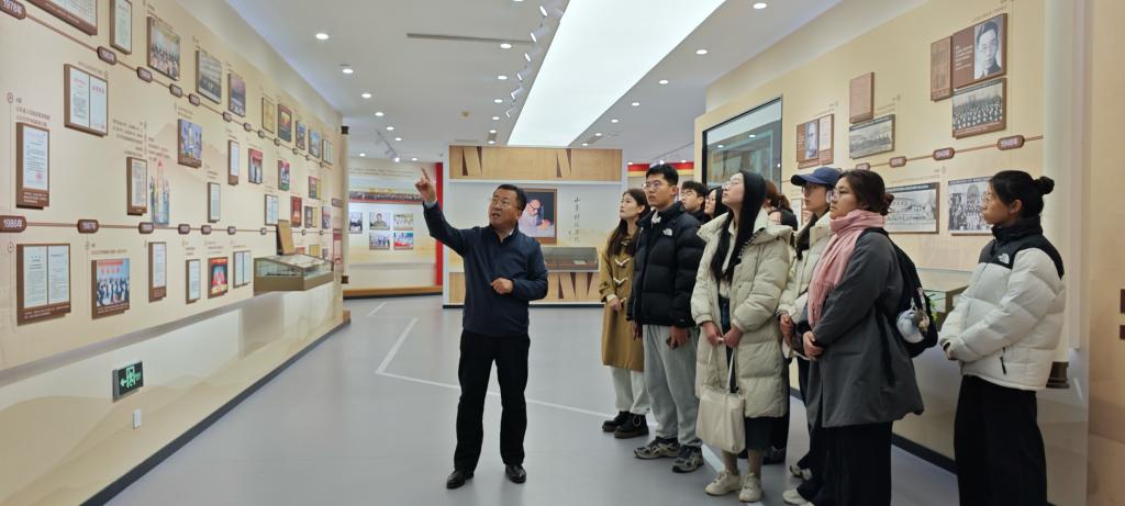 2023级法学四班班干部和党员代表在燕山校区参观“奋进的历程——山东财经大学办学成就展”。校党委委员、宣传部部长于洪良做了讲解,并与学生干部交流,了解班级建设情况。