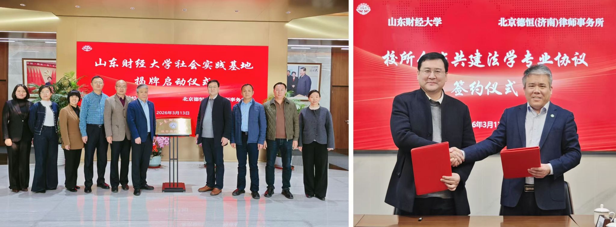 在热烈友好的氛围中,张琳与高秀峰代表双方共同签署《校所合作共建法学专业协议》,并共同为“山东财经大学社会实践基地”揭牌。协议的签署与基地的建立,标志着双方合作正式进入制度化、常态化运行阶段,为学生搭建了直接接触法律实务、提升专业技能的优质平台。
