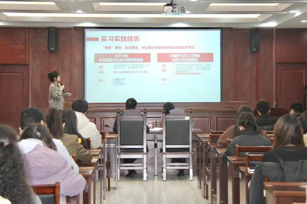 本科三、四年级学生和全体研究生,主要考察同学们求职的实战能力,个人发展路径与经济社会发展需要的适应度,就业能力与职业目标和岗位要求的契合度。现场每位参赛选手有五分钟的自我陈述时间,评委进行时长为三分钟的提问。参赛选手按照抽签顺序依次上台展示。