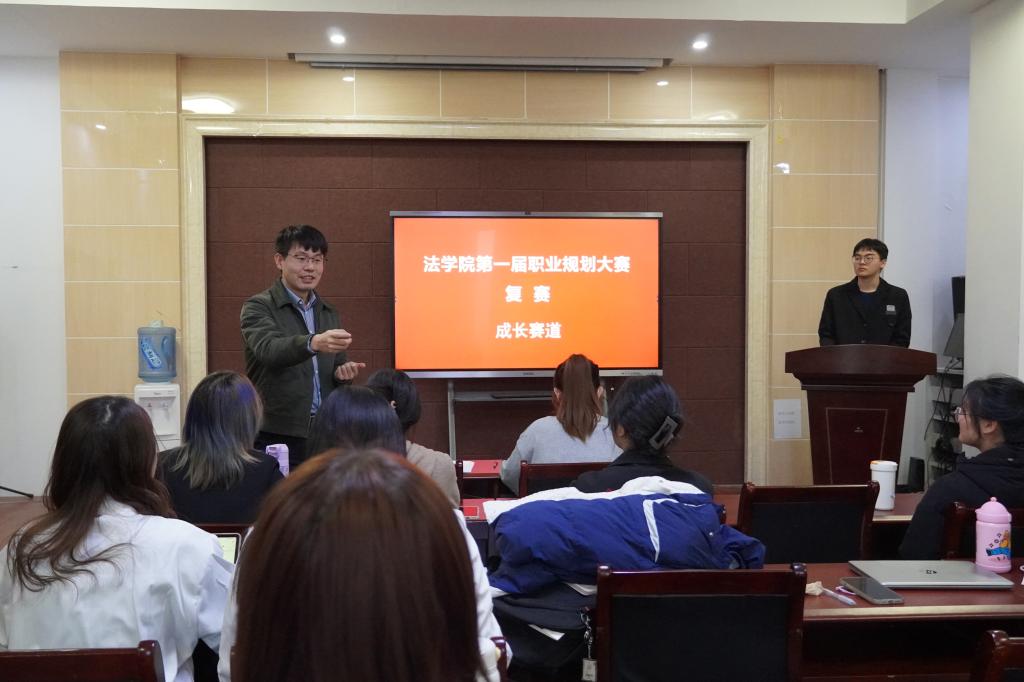 在成长赛道的复赛中,赵金鹏老师首先代表学院进行致辞,向同学们介绍了当前法学专业的就业前景,希望同学们通过此次职业规划大赛对未来职业目标更加明确,提升自己的规划能力和竞争力。在随后的比赛过程中,选手们激情洋溢思路清晰,结合自身的专业特长和兴趣爱好,提出了各具特色的职业规划方案,展现了自己的综合素质和创新思维。同时对于评委提出的问题随机应变,应对自如。评委老师们在现场也对每一位选手的规划提出了专业的指导建议。最后,赵老师对成长赛道赛段进行总结。他表示希望大家回归初心,明确参赛目的,用心思考自身,并衷心祝愿大家在此次比赛中取得优异成绩。